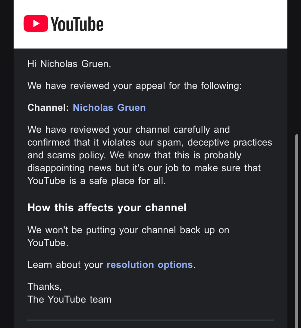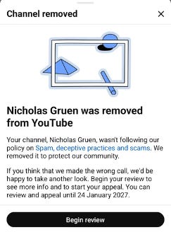 Then I got an email from YouTube telling me my channel had been ‘removed’ for violating YouTube’s policy on “spam, deceptive practices and scams”. I am completely mystified by this.